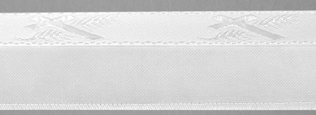 Produktinformationen "Meter Steg, Serge weiß, beids.abgekett., Vlies hinterl.+angenähtem Lotband Kreuz/Palme weiß (á 100 m"
