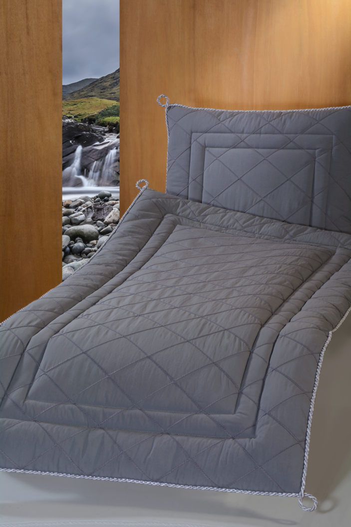 Deckengarnitur 01450 Pisa grau, Baumwoll-Oberstoff in grau mit genähten Biesen und Kordel als Abschluss.