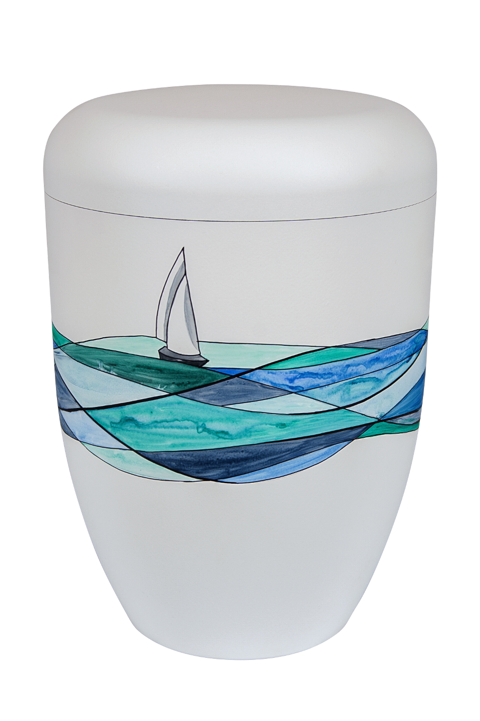 Urne Dia0003201 b Naturstoff, weiß matt, Lange Reise, handbemalt