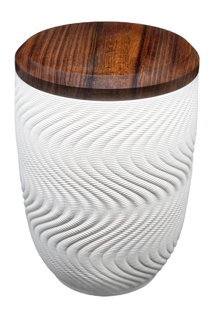Urne 77113 Keramik, crèmematt, Struktur: Stromlinie aus 3D-Druck, Deckel Nussbaum